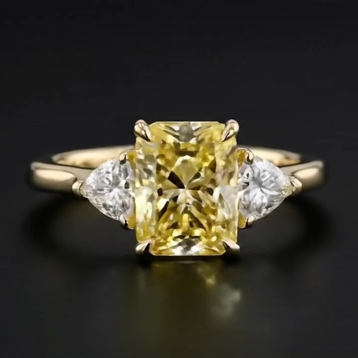 Radiant-cut yellow moissanite center stone with exceptional fire