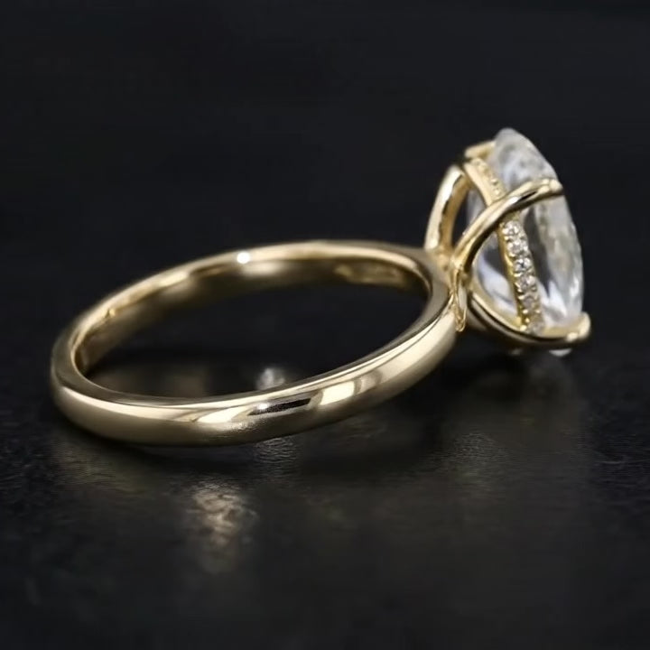 Crafted with a polished gold band, the ring features a secure four-prong setting that allows light to flow effortlessly through the Moissanite, maximizing its radiance. Delicate pavé accents along the gallery add a subtle shimmer, elevating the design with understated sophistication.
